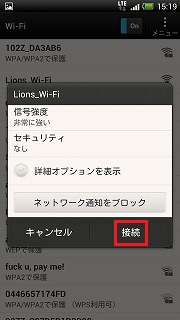手元の無線LAN機器(スマートフォンなど)で、SSID名“Lions Wi-Fi”に接続します。