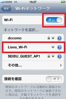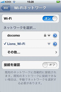 - 「ネットワークを選択...」の一覧に「Lions Wi-Fi」があるので、それを選択します。しばらく待つと接続されます。(上部の 「3G」や「LTE」アイコンが、無線LANのアイコンに変わります)